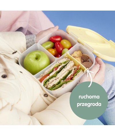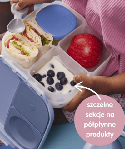 - Przechowywanie: Idealny do jogurtów, hummusu, warzyw i owoców — należy jednak pamiętać, że lunchbox nie nadaje się do płynnych posiłków.