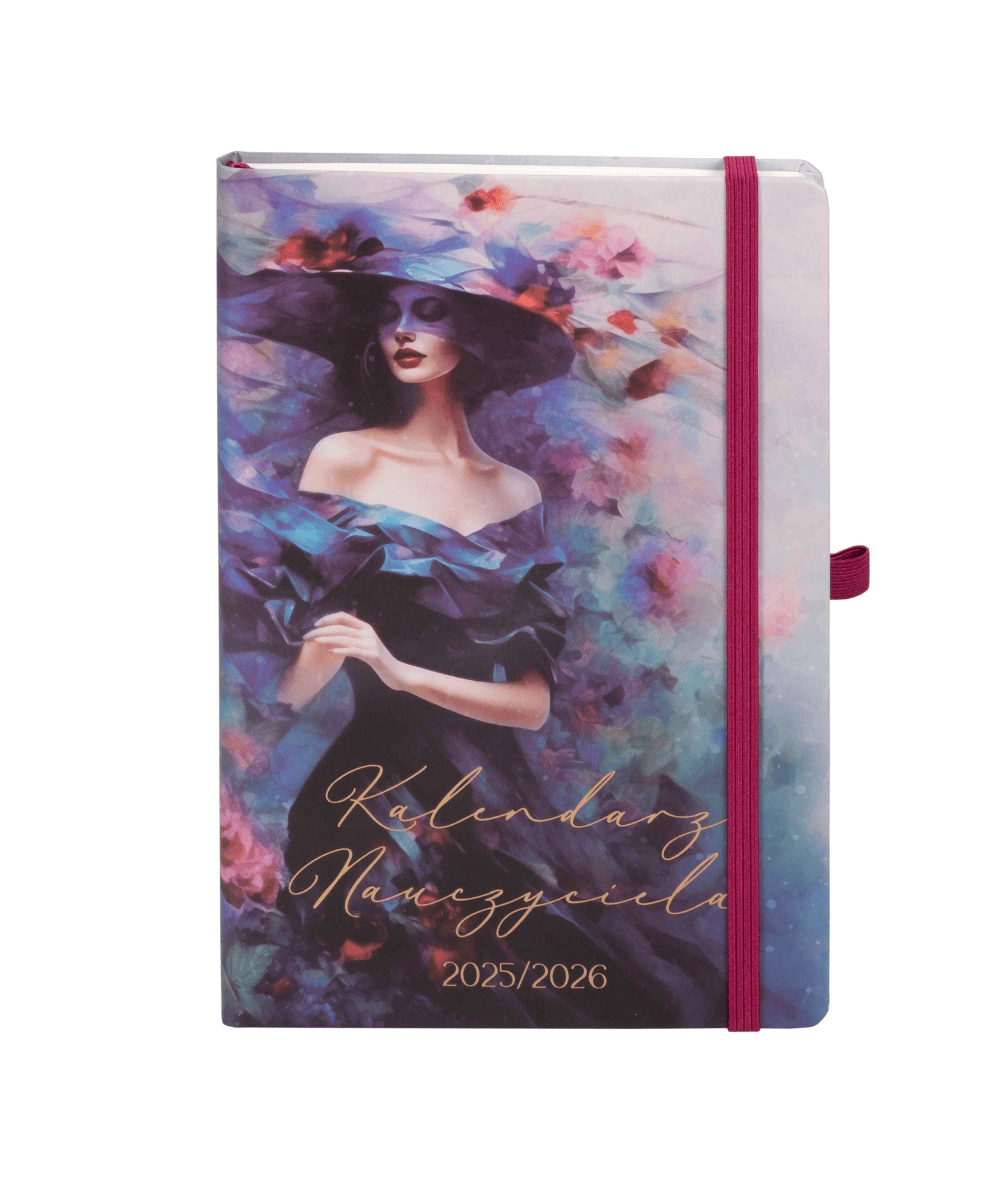 Damski kalendarz dla nauczyciela w formacie A5 na rok szkolny 2025/2026. Kalendarz ma układ tygodniowy oraz miejsce na notatki. Kalendarz w twardej oprawie z okładką z piękną kobietą w towarzystwie kwiatów.