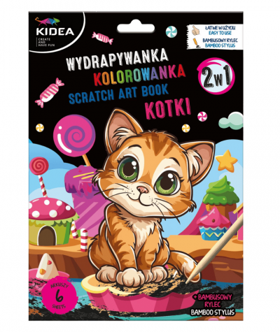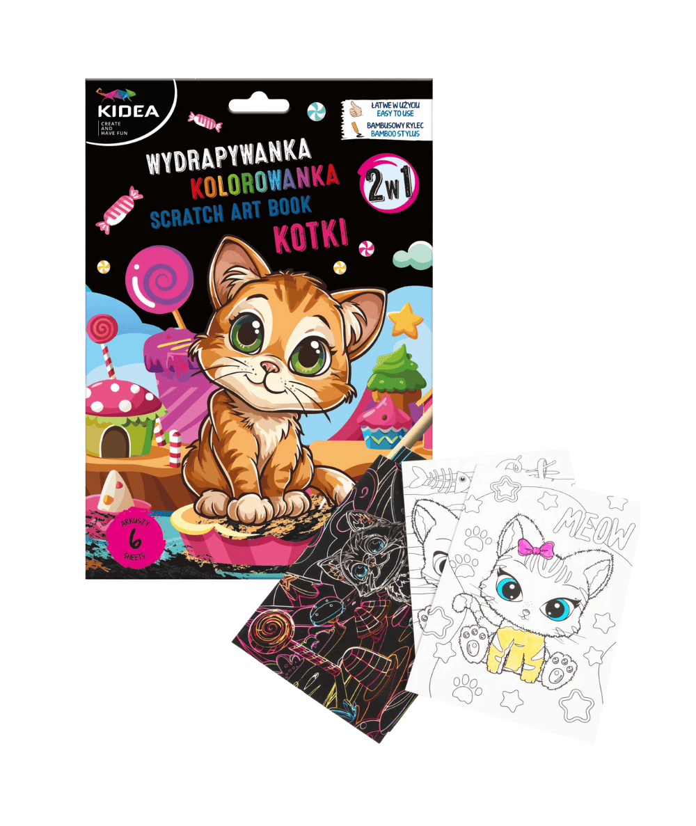 WYDRAPYWANKA kolorowanka 2w1 KIDEA KOTKI dla dziewczynki zestaw 6 ark. z rylcem