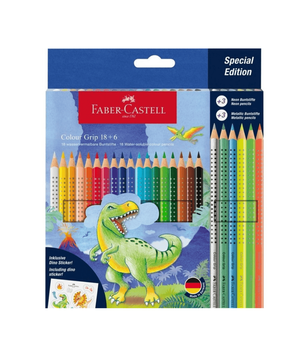 Kredki ołówkowe Faber-Castell GRIP ergonomiczne DINOZAURY 24 kolory metaliczne neonowe