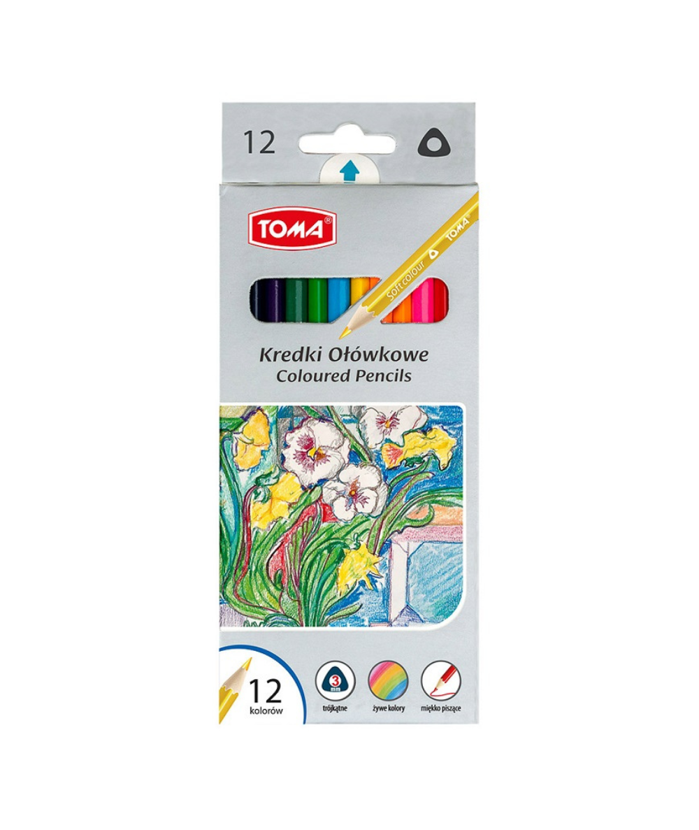 Kredki ołówkowe trójkątne TOMA żywe kolory, miękko piszące 12 kolorów