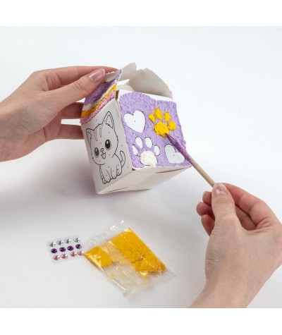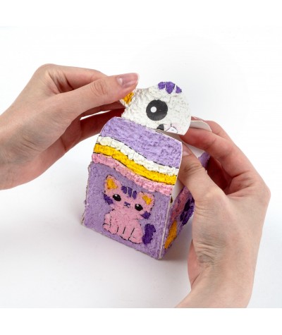 Zawartość zestawu: • Szablon pudełka • 5 kolorów masy papier-mâché: biały, żółty, jasny fiolet, ciemny fiolet oraz różowy • Rysik do nakładania masy • 12 diamentowych naklejek