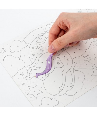 Kreatywna zabawa, która pozwala stworzyć efektowną ilustrację bez użycia farb, wody czy pędzli. Obraz został podzielony na pola oznaczone numerami – zadaniem jest dopasowanie do nich właściwych naklejek z dołączonych arkuszy. Dzięki temu proces tworzenia jest prosty, czytelny i odpowiedni także dla młodszych dzieci. Wyklejanie sprzyja skupieniu, ćwiczy precyzję ruchów i cierpliwość, a jednocześnie zapewnia komfort zabawy bez zabrudzonych rąk i nieporządku. Bajkowy jednorożec w magicznej scenerii przenosi dziecko do świata wyobraźni i fantazji. Po ukończeniu pracy obraz można umieścić na tekturce, dzięki czemu stanie się gotową ozdobą pokoju lub pomysłem na wyjątkowy upominek.