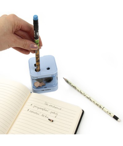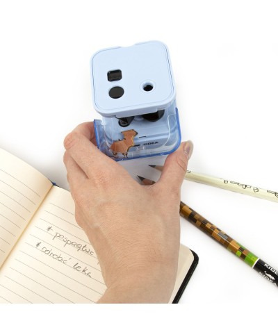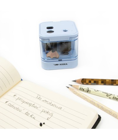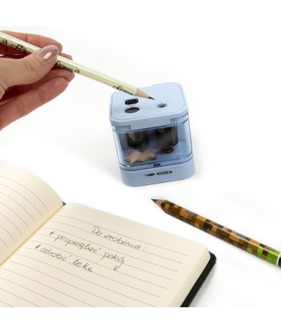 Niebieska temperówka elektryczna podwójna KIDEA to praktyczne narzędzie do ostrzenia ołówków i kredek standardowych, jak również grubych Jumbo.