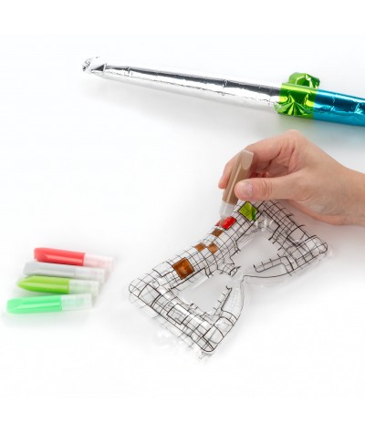 - Dziecko najpierw koloruje maskę specjalnymi żelami — może wybrać swoje ulubione barwy i stworzyć zupełnie unikatowy wzór. Po nałożeniu kolorów wystarczy odłożyć maskę na około 5 godzin, aby żel dobrze wysechł.