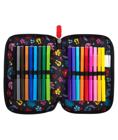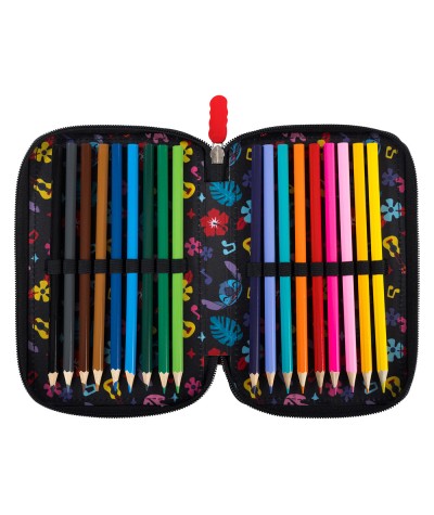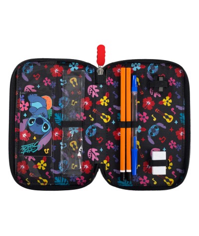 Nowość od St.Majewski! Utrzymany w modnej, czarnej kolorystyce z tropikalnymi akcentami i wizerunkiem uroczego Sticha przyciąga wzrok i wyróżnia się na tle innych. Trzy pojemne komory pozwalają na wygodne uporządkowanie szkolnych przyborów, które zostały dołączone do piórnika. Wysokiej jakości materiały oraz solidne zamki zapewniają trwałość i komfort!