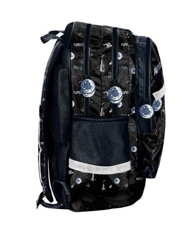 Czarny plecak z efektownym nadrukiem astronauty i logiem NASA zachwyci każdego małego pasjonata gwiazd i planet. Model 116 to nie tylko świetny wygląd – to także funkcjonalność: dwie główne komory, dodatkowo mniejsza z przodu, boczne kieszenie z siatki i profilowane plecy zadbają o wygodę i dobrą organizację szkolnych dni.