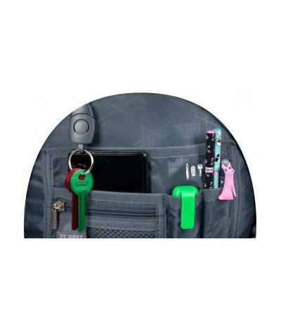 - kieszeń z siatki na zamek, przegródki na przybory do pisania