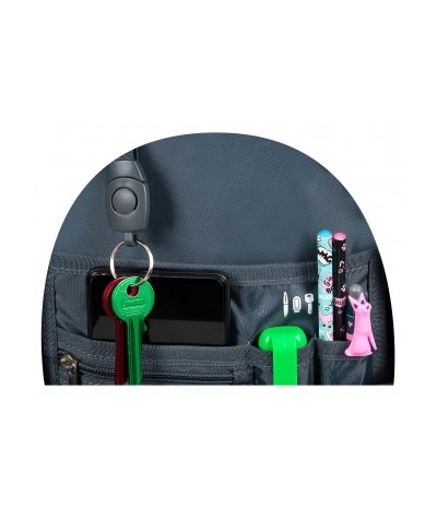 - kieszeń z siatki na zamek, przegródki na przybory do pisania