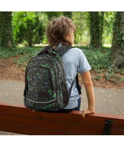 Zielone printy na tym dwukomorowym plecaku prosto z gier komputerowych sprawiają, że jest jeszcze bardziej wyrazisty i z pewnością spodoba się każdemu chłopakowi! Komfortowa budowa plecaka zapewnia wygodę na całe dni w szkole. Dzięki regulowanym szelkom dopasujesz plecak idealnie do wzrostu dziecka, natomiast pokryte oddychającą siatką wyprofilowania zapewniają wentylację, co jest bardzo ważne w ciepłe dni.
